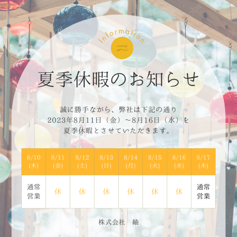 誠に勝手ながら、2023年8/11〜8/16を夏季休暇とさせていただきます。