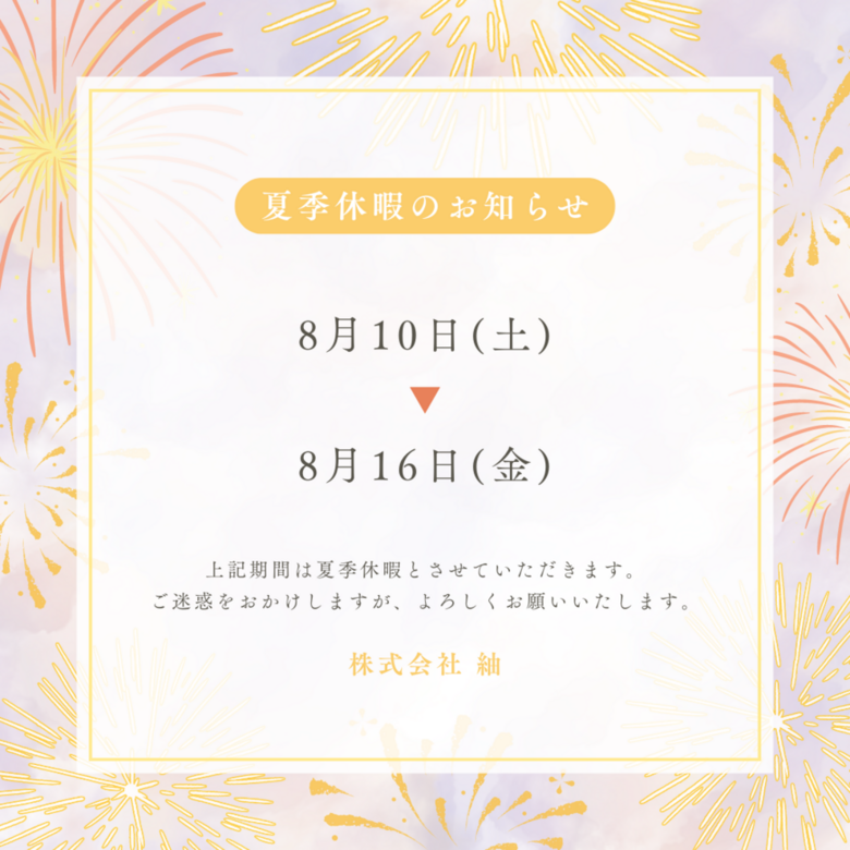 誠に勝手ながら、2024年8/10〜8/16を夏季休暇とさせていただきます。